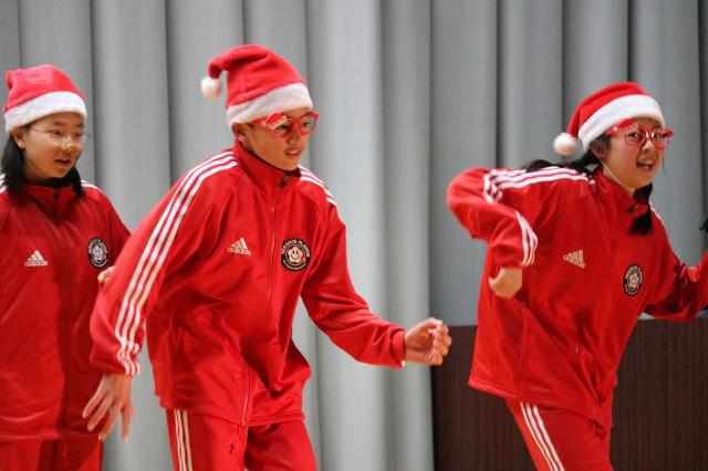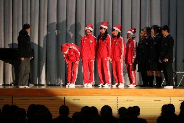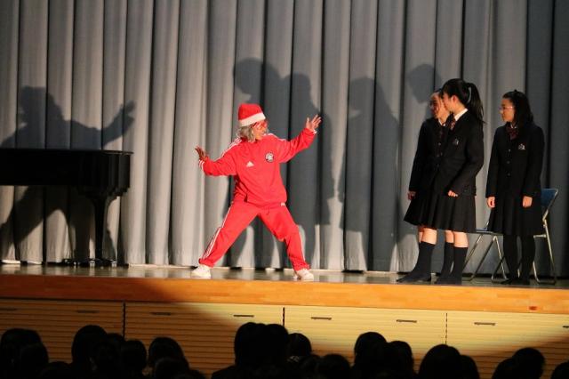 終業式の後、生徒会主催のクリスマスコンサートが行われました。生徒会長が着物姿で、クリスマスにまつわる“小話”からコンサートが始まり、音楽部による恒例のハンドベルの演奏、合唱があり、生徒たちは、美しい歌声に聞き入っていました。