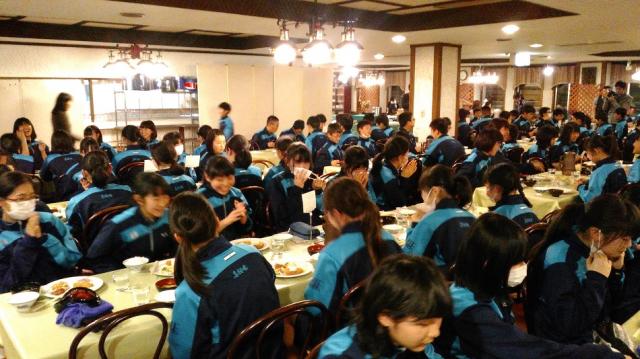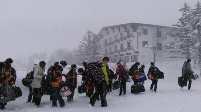 到着すると、これから4日間お世話になるホテルの方にあいさつし、その後、夕食を食べました。和気あいあいと食事を楽しみ、おかわりを何度もする生徒の姿も見られました。食事の後の片づけもきちんとできました。夜はゆっくり休み、明日のスキーに備えます。