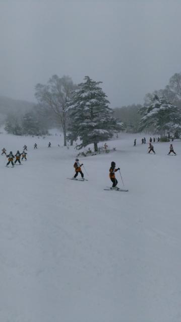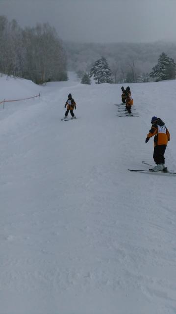 午後からは、どのグループも、リフトにのってはアヒルの行列のようにシュプールを描いて降りてきて来ます。みんな、上達が早く、隣の一ノ瀬にも足をのばし、林間コースや広いゲレンデを楽しみました。