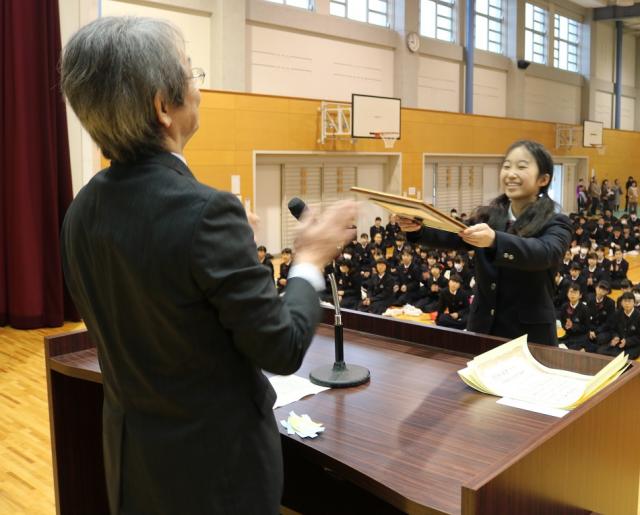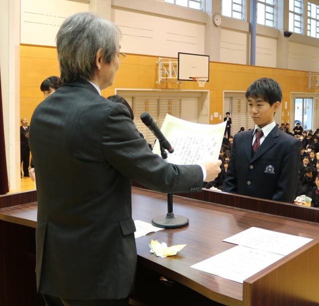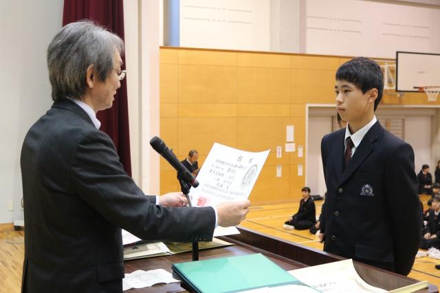 また、生徒指導部の教員から、冬休みの注意等がありました。そのあと、夏休みから2学期にかけて活躍した生徒の伝達表彰が行われました。