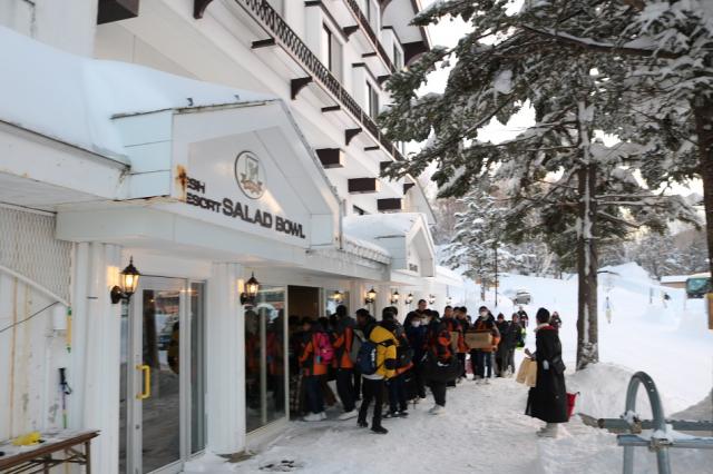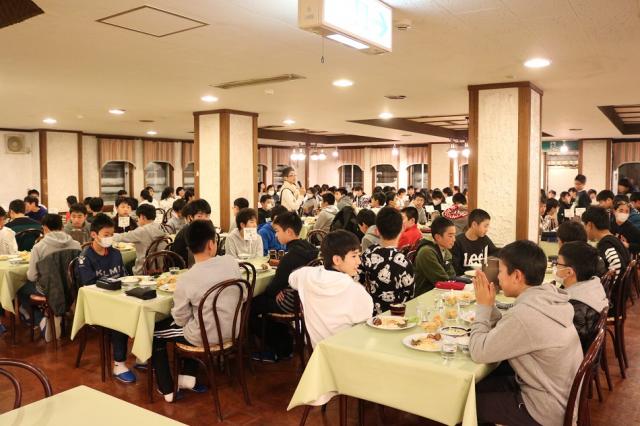 到着後、これから4日間お世話になるホテルの方に挨拶し、その後夕食をいただきました。行儀よく和気あいあいと食事をしていました。また、おかわりを何度もする生徒の元気な姿も見られました。到着は遅れましたが、みんなの素早い行動により、就寝時間は予定通りでした。夜はゆっくり休み、明日のスキーに備えます。