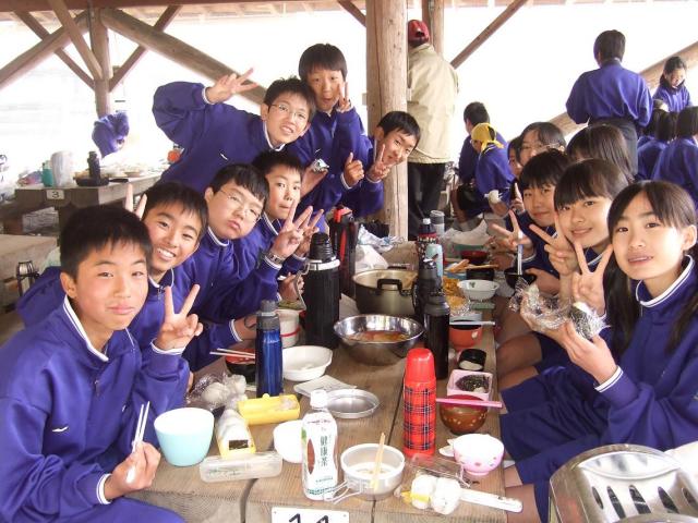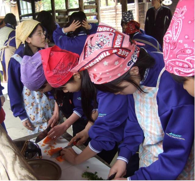 当日は、ふるさと村内の“おばあちゃんの店”で、各班二千円の予算内で食材の購入です。慣れない手つきでごぼうやにんじん、里芋を切る者、一生懸命うちわで扇いで火をおこす者と、実にみんな楽しそうでした。正午前にはどの班も美味しい豚汁とサイドメニューの完成です。たくさんおかわりもできました。
