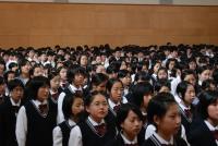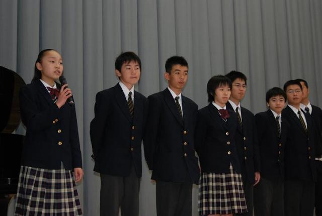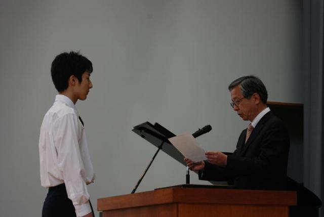5月15日(金) 6年制中高の生徒が一堂に会して月例朝礼が行われました。バトントワリング全国大会3位入賞の河原風雅君(高1)の伝達表彰のあと、中高それぞれの生徒会会長の所信表明演説と役員紹介がありました。