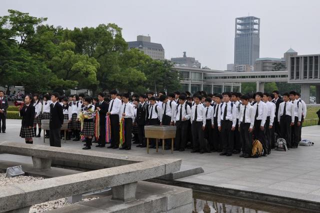 原爆慰霊碑の前で平和のセレモニーを行いました。