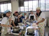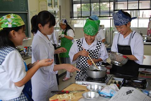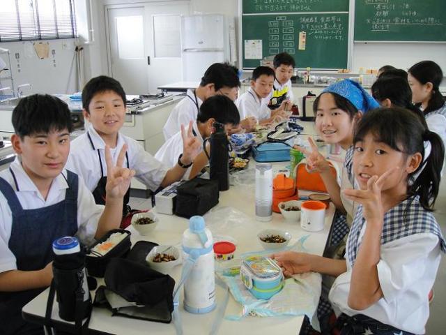1年生が初めての調理実習に挑戦しました。慣れない包丁で具材を切り、みんなで協力して美味しい(?)ひじきと大豆の煮物を完成させました。できた煮物をさっそくお弁当と一緒に食べました。となりの班の煮物と交換して味見をしあっている人もいました。毎日おいしいご飯を作ってくれている家の人へのお返しの意味も含めて、今回のメニューを家でも作ってみては?