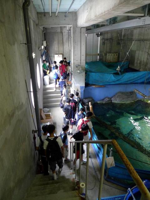 8月19日(水)、創作科学部の生徒20名が参加しました。まず鳥羽水族館の裏側を探検し、その後、じっくり一日かけて館内を見学しました。普段は見ることのできない水族館の裏側を飼育係の方と一緒に見てまわる企画で、水槽を裏側から見ながら管理や生態の話をお聞きし、また、えさのやり方および準備の仕方を教えていただきました。飼育係しか知らない裏話が聞けたり、活発な質問もできたりと、日頃の見学とは一味違った大変良い機会となりました。