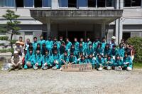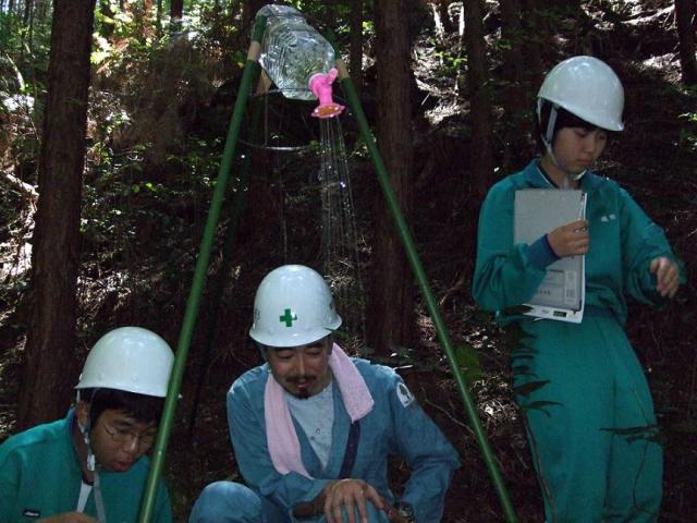 その一環で、8月24日(月)、中学3年生の生徒35名が東京大学愛知演習林を訪ね、蔵治講師および田中助教、技術職員の方々の指導のもと「緑のダム実験」および「森の健康診断と間伐体験」を行いました。