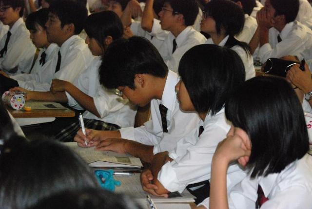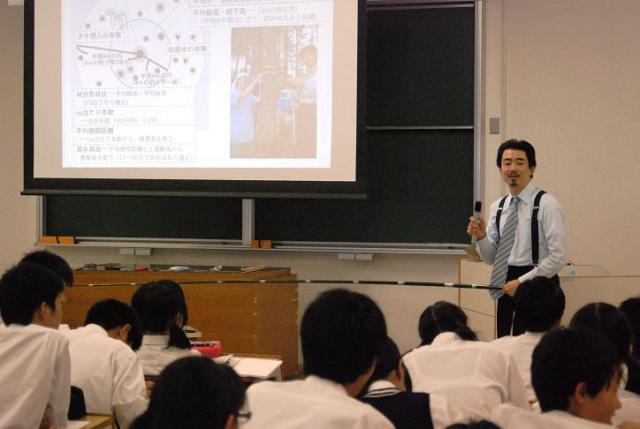 10月2日(金)東京大学愛知演習林の蔵治光一郎先生をお招きし、理科特別授業「森の健康診断」の講義が行われました。講義は先生のライフワークである「森と水」の関係から始まり、日本の人工林の現状に関するビデオ、そして実際にフィールドに入って行う「森の健康診断」の手法などについて、分かりやすくお話がありました。生徒たちは難しい内容にも関わらず、蔵治先生の話に引き込まれ、日本の森林について興味を深めたようでした。この講義の後19日からクラスごとに、「松阪森林公園」付近の実際の森に入っての調査実習が行われます。