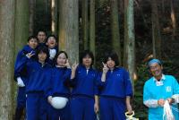 10月30日(金) 2年生の理科特別授業『森の健康診断』野外実習が行われました。今回行われたのは2Aで、4クラス中2クラス目です。生徒たちは愛知県で先駆的な活動をしている「矢作川水系森林ボランティア協議会」の方々に率いられ、約7名ずつの班に分かれて森に入り、植生や混み具合に関する調査を、森林公園付近の人工林を使って行いました。