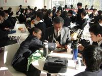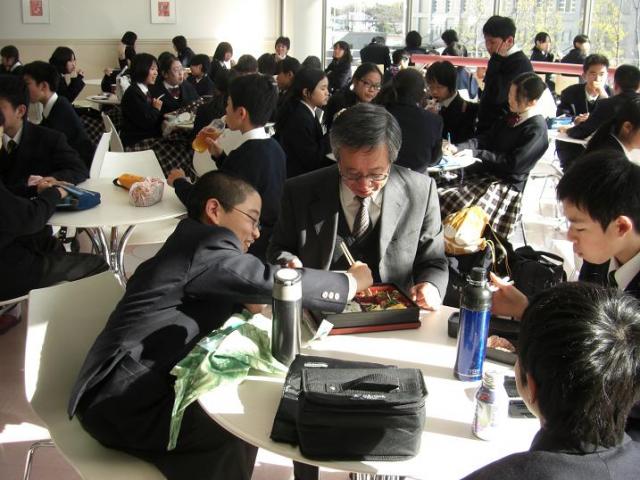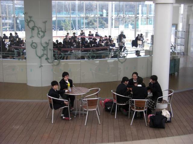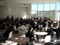 校内にあるカフェテラス「ディスコランテ」は、普段は高校生が昼食を食べるのに利用しているのですが、保護者懇談会中は中学生にも開放されました。「ディスコランテ」は天井が高くガラス張りですので、室内には光が溢れ、暖かい陽射しで一杯です。どのテーブルでも友達と楽しくお弁当を広げる姿が見られました。また、開放感のある外のテラスでも談笑する姿がありました。あまりの心地よさに先生たちも一緒になってお弁当を広げました。