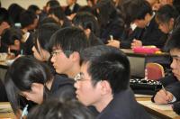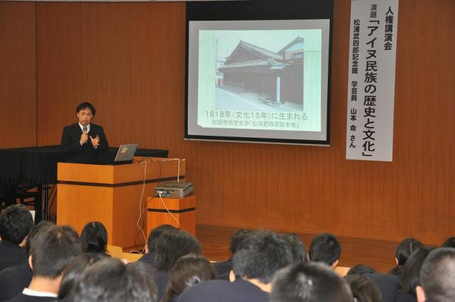 1月20日(木) 3年生の人権学習の一環として講演会がありました。松阪市の松浦武四郎記念館の学芸員である山本命さんをお招きし、「アイヌ民族の文化と歴史」というテーマで、松浦武四郎とのかかわりからアイヌ民族の文化と彼らがたどった差別の歴史について学びました。