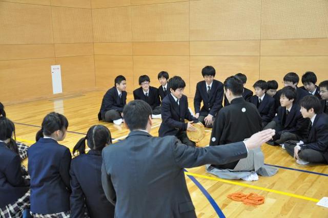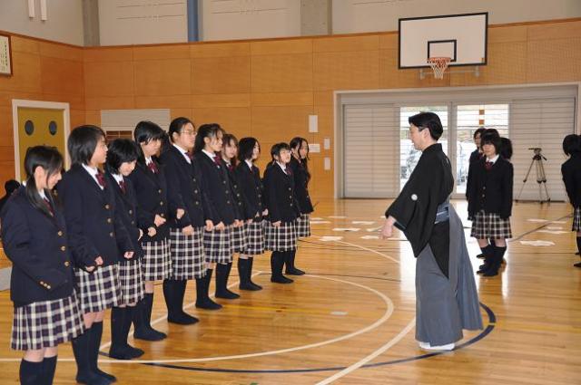 2月17日(水) 2年生音楽科特別授業『能楽囃子体験鑑賞教室』が、岡三加藤文化振興財団の助成で、第一線でご活躍の小鼓大倉流の吉阪一郎さんを始め5名の方をお招きし、実施されました。