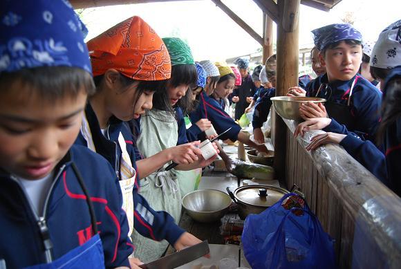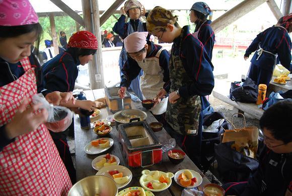 4月20日(火) 2年生が多気町の五桂池ふるさと村に遠足に行きました。グループに分かれそれぞれレシピから考えて、豚汁+αをつくりました。あいにくの雨でしたが、皆で力を合わせてつくった料理は最高の味でした。午後のレクレーションは学校に帰ってから、体育館でドッジボールを楽しみました。