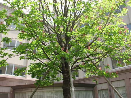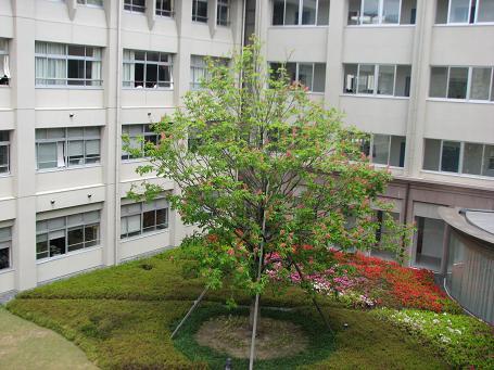 1号館と2号館の間の中庭にあるシンボル・ツリー「マロニエ」がピンク色の花を咲かせました。周囲のつつじも咲き始め、キャンパスがもっとも美しくなる季節となりました。