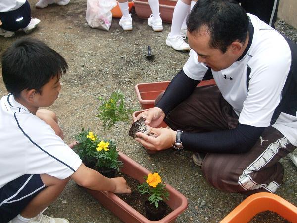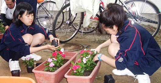 学校に花の潤いを与えることを目標に、1~3年生24名の委員が、マリーゴールドやサルビアなどの花をプランターに植えました。園芸委員の生徒たちは、こういう作業が好きな生徒たちが集まっていて、土の触れることも平気で、楽しんで作業を行いました。それぞれが植えた花は、中学校の玄関に並べられました。これから委員が交代で水遣りなどの世話を行い、10月まで花を咲かせる予定です。