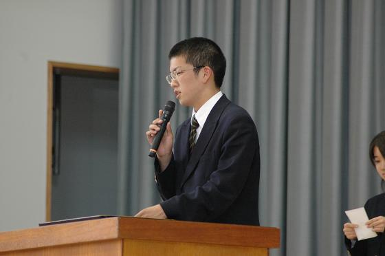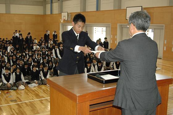 5月16日(金) 前期クラス及び生徒会役員の任命式と17日(土)・18日(日)・24日(土)に行われる松阪市中学校総合体育大会への出場クラブの壮行会がありました。生徒会については、すでに昨日(15日)の朝礼で、会長の所信表明がありました。壮行会では、それぞれのクラブの代表が決意や抱負を述べました。