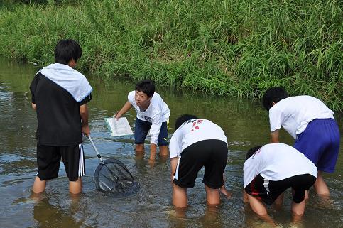 8月11日(水)、3年生の希望者20名が理科特別講座として、松阪市内の阪内川の水生生物調査を行いました。午前中、生徒たちは水中の石の裏や、川岸の水草の間にいる生き物を採取しました。それを学校まで持ち帰り、理科室で双眼実体顕微鏡で生物を観察し、名前を特定しました。今回の調査で、阪内川内五曲町付近と桜町付近の水質は「水質階級Ⅱ~少し汚い水」と判定されました。生徒たちの多くは、身近な川にも実際に入ってみるといろいろな生物がいることを実感したようでした。この調査は、9月には上流域で行われる予定です。