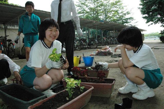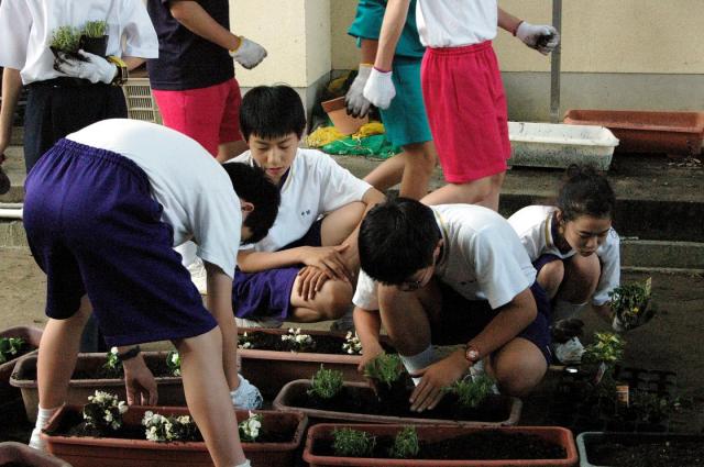 6月16日(月)、園芸委員会と創作科学部の合同で、構内のプランターの植え替えを行いました。日々生徒たちの生活空間や登下校の道々に花のある環境を整えようといった、以前からの取り組みで、学校に彩を添えてくれます。