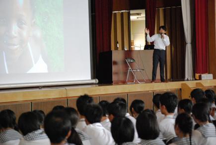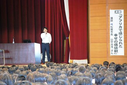 この度の講演では、アフリカでの経験を通して感じられたことを、ご自分で撮影された写真とパワーポイントを用いて、生徒とやりとりをしながら、熱を込めて語っていただきました。「何が幸せなのか?」と考えさせられる重みのある、心に残る講演となりました。山中市長、ありがとうございました。