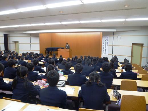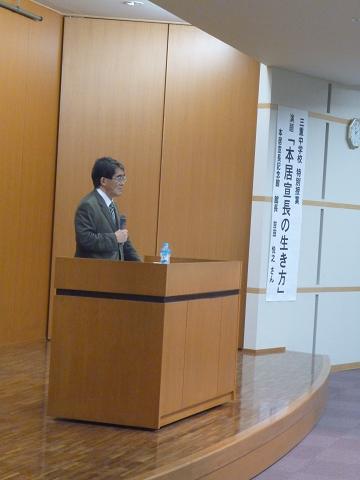 11月26日(金) 2年生で本居宣長に関する国語科特別授業がありました。国語科で取り組んでいる松阪が生んだ国学者本居宣長に関する学習の一環として、本居宣長記念館の吉田悦之館長を招いて、「地図を描く少年-本居宣長の生き方」というテーマで講演を聴きました。吉田館長は三重中高の卒業生でもあり、「ようこそ先輩」という形となりました。