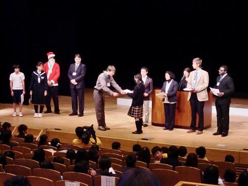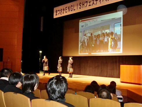 12月11日(土) 恒例の「まつさか ENGLISH フェスティバル」が行われわれました。英語によるパフォーマンスの発表を通して英語を楽しむという趣旨で、市の教育委員会が開催するものですが、小学校での英語の履修が始まり、年々充実したものとなっています。三重中学校も2年生の3人が英語で学校行事の紹介をしました。3人による掛け合いを通して国際交流と夏季合宿を紹介しました。動きを交えた、ユーモアあるれるパフォーマンスは、演じている人自身が楽しんでいることが伝わってくるすばらしいものでした。