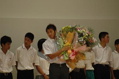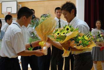 激励会では、贈られた激励の花束を抱え、「僕もメダルを持ち帰れるように、一生懸命頑張ってきます。みなさんもスポーツに、勉強に、頑張ってください。」と、自身の決意と在校生への激励の言葉がありました。