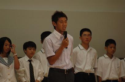 北京オリンピックサッカー予選では主将としてチームを引っ張り、日本代表を4大会連続出場へと導いた水本裕貴選手の激励会が、7月17日(金)に第2体育館で行なわれました。