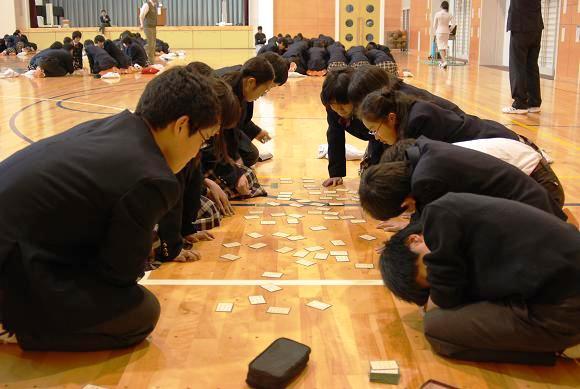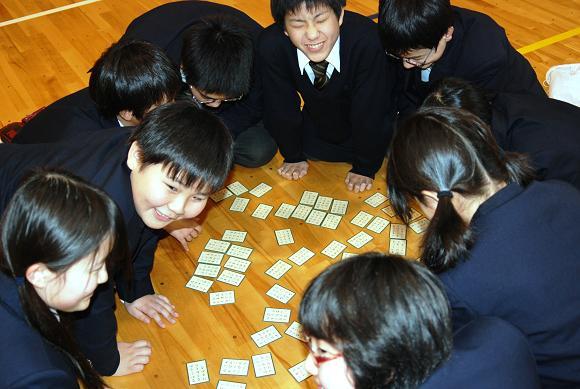 2月25日(金)6時間めのロングホームルームの時間を利用して、第2体育館で中学一年生が、「百人一首選手権大会」を開催しました。各クラスを6チームに分け、全部で24チームが他のクラスのチームと対戦する形式です。