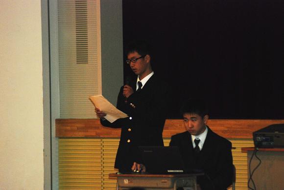 3月16日 三重中学校自由研究発表会が行われました。これは夏休みの宿題で全員が行った自由研究の作品の中から、優秀作を本人がパワーポイントを使って、学会形式で全員に発表をする行事で、今年で2回目となります。今回の発表は1D沼田龍太郎くん「泥汚れをより効果的に落とす方法」、1C松田祐紀くん「缶内の水温と色の変化」、2A二村友康くん「伊勢湾の環境と貝類の分布」の3本で、どれも各学年を代表する作品で堂々とした発表が行われました。