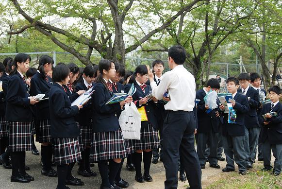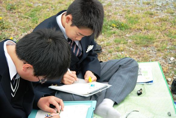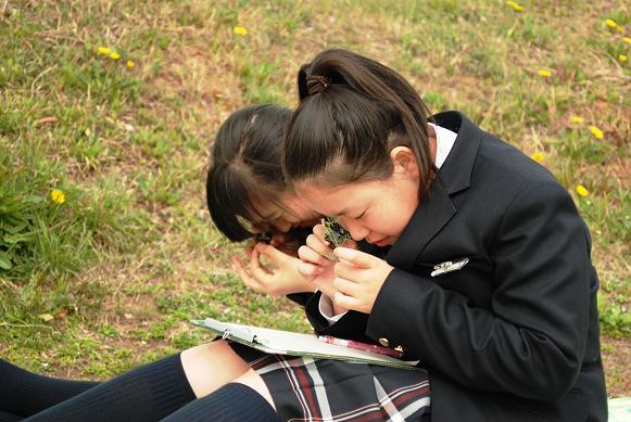 1年生の授業は、まず顕微鏡をのぞきます。その後、外に出て野外実習。植物の観察を行います。
