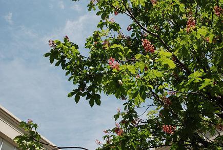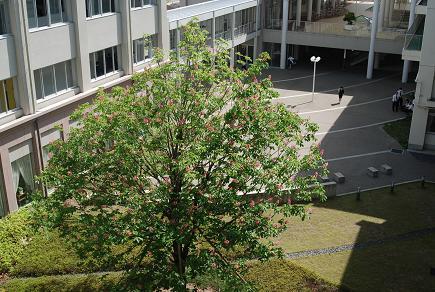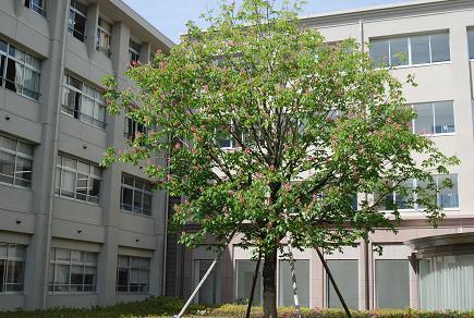 学校のシンボルツリー中庭のマロニエがピンクの花を咲かせました。 故梅村光弘副総長がフランス旅行をされたとき強く印象に残ったマロニエを是非新校舎にという遺志に従って植樹されたものです。奇しくも毎年学園創立記念日の5月17日ころに満開となります。