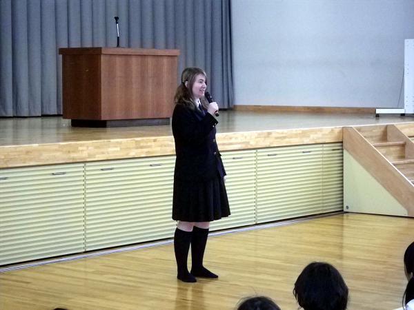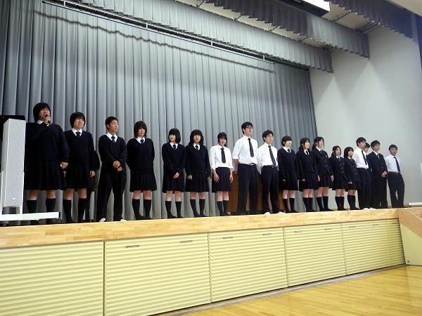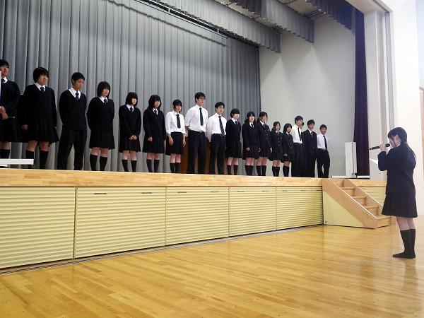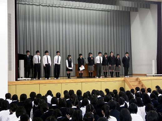 5月14日(土) 5月の月例朝礼があり、6年制の中高生が集いました。毎年5月は前期生徒会役員の紹介と会長の所信表明がありますが、今回はそれに加えて、県総体に出場する選手の激例会と留学生の紹介がありました。