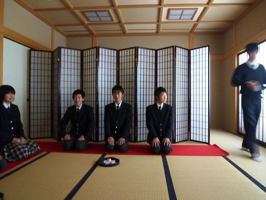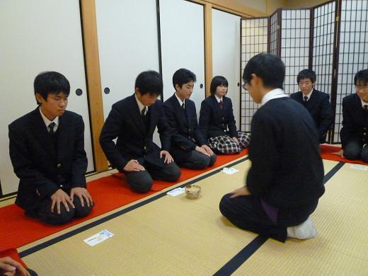 茶道部では折々教員などを招いてお茶会を催していますが、12月13日(火) には高校の茶道部が中学サッカー部3年生を招いて、礼法室の梅香庵で「清友茶会」を催しました。招待客がサッカー部ということもあり、男子部員がお茶を立てました。高校部に進んだら是非茶道部にという勧誘も兼ねてのようでした。 普段はボールを追ってグラウンドを駆け回っている部員も、和室に正座で緊張した面持ちでした。