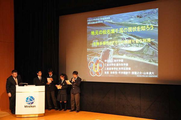 12月26日(月)、東京の日本科学未来館で、中学創作科学部・高校科学技術部が日頃行ってきた松名瀬干潟に関する調査の成果『地元の松名瀬干潟の現状を知ろう』を発表しました。発表をした全国の中高生との交流や、いろいろな先生方とのディスカッションがあり、充実した一日となりました。