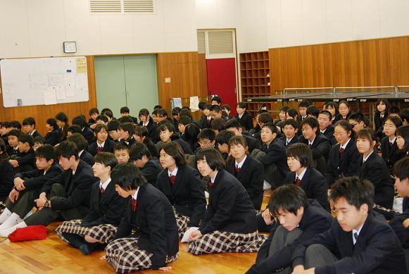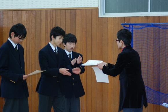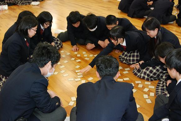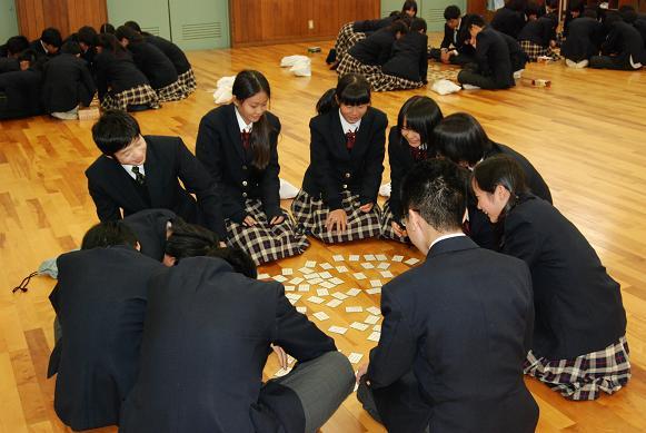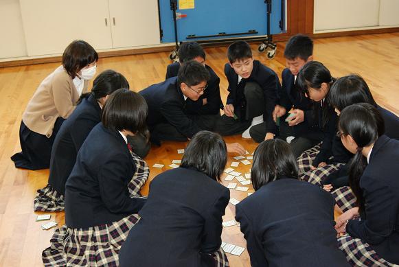 1月10日(火)、2学年の新年恒例行事「百人一首大会」が行われました。1年生から「国語乙」の授業で暗記してきた「百人一首」の力を発揮する絶好の機会です。学年を24チームに分け、12の対戦を行いました。 「あさぼらけ~~~」っと、先生の詠み声が響くと、サッと札に手が伸びる生徒も多勢います。お気に入りの札が取れなかったときには、「ワァ~~~っ」と悔しそうな声が響いていました。 チームではD組1班が、個人では昨年に引き続きA組の塩野さんが金賞を獲得しました。