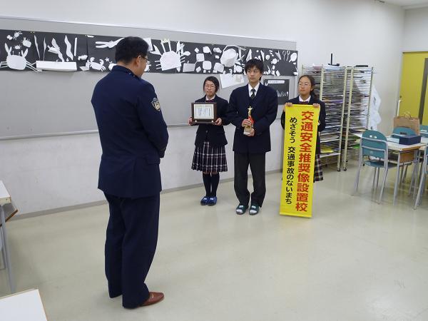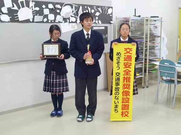 松阪市内の中学生の交通安全意識向上と事故防止を目的に、各中学校にリレー形式で設置される交通安全推奨像の伝達式が1月11日(水)に行われました。三重中では三雲中学校から引き継いだ推奨像を3月31日まで設置し、この間生徒会が中心となって交通安全に取り組むことになります。