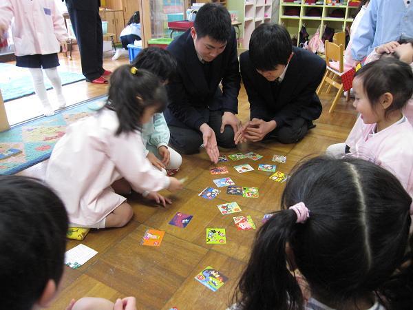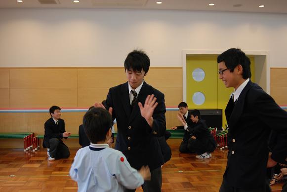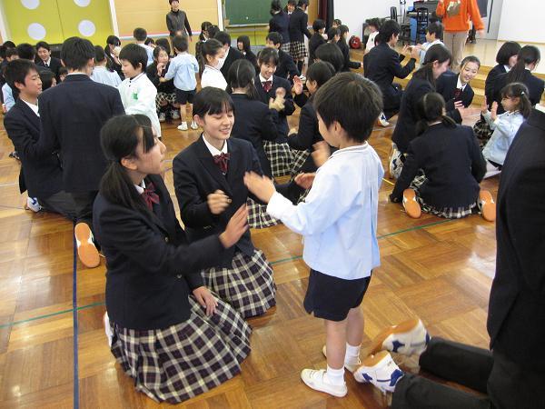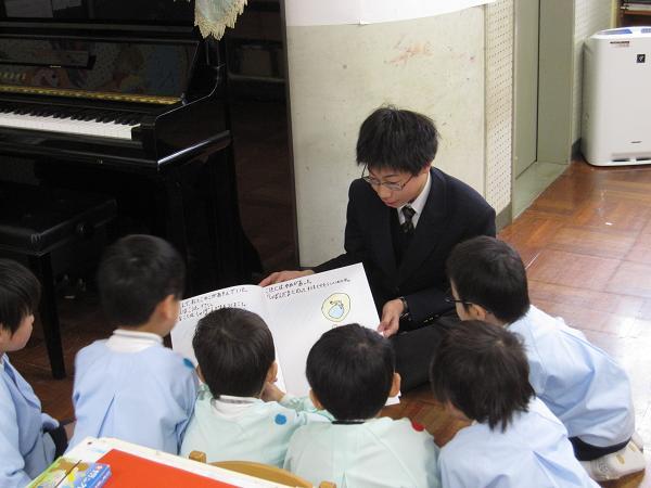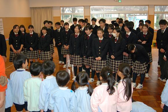 2月6日(月)・7日(火)の両日、それぞれ2クラスずつに分かれて、家庭科の授業の一環として梅村幼稚園で保育体験を行いました。両日ともあいにくの雨で、園庭での遊戯はできませんでしたが、授業で作成したオリジナルの絵本の読み聞かせをしたり、室内で一緒に遊戯をしたりしました。最初は中学生の方に戸惑いがありましたが、園児の人懐っこさに助けられ、積極的に関われるようになりました。中学生の中には梅村幼稚園出身者が何人もいて、思わぬ形での「母校」訪問となりました。