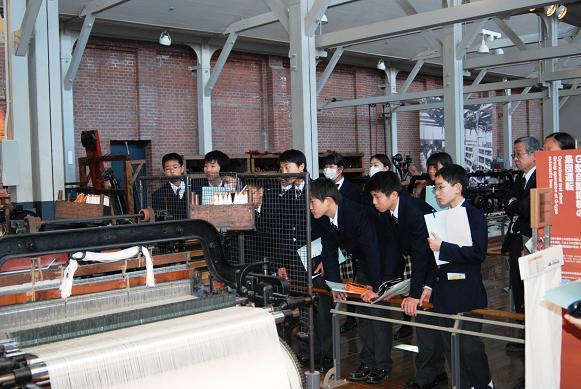 午前中は全員がトヨタテクノミュージアを見学しました。見学の中心となった繊維機械館での見どころは「紡ぐ・織る技術の基本と繊維機械技術の移り変わり」です。道具から機械への発展が興味深く、社会科の授業で学習した紡織機も展示されていました。人力で稼動する糸車による糸紡ぎから、機械による紡織まで、実際に機械を見ながら学習しました。「必要は発明の母」といいます。その機械を自動化する必要性から、細かい試行錯誤の上改良されていったその過程を、係りの方による、実際に機械を稼動させながらの丁寧な説明で学ぶことができました。普段手にしている繊維製品一つ一つに長い努力の歴史が凝縮されていることが実感できました。