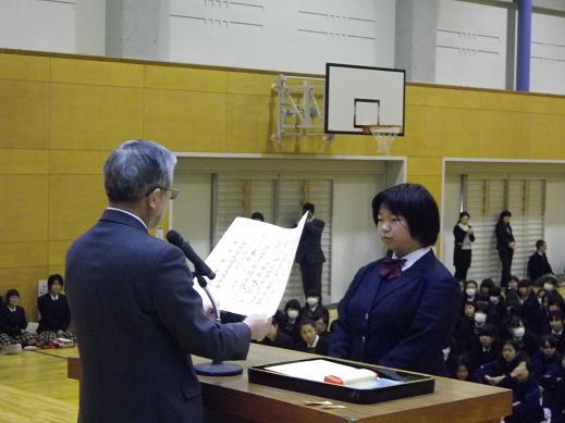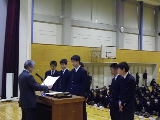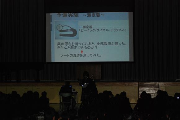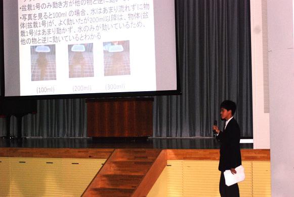 3月13日(火)、読書感想文の全国大会などの伝達表彰のあと、恒例の理科の研究発表会が行われました。夏休みの自由研究を中心とした全国大会の入選作品など各学年から選ばれた一人ずつがパワーポイントを用いて発表しました。中には中学生とは思えない高レベルの研究もあり、クラスメートの「力」を知り、自分の励みとする良い機会となっています。