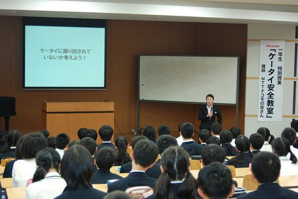 5月2日(水)、1年生対象に携帯電話の正しい使い方に関する『ケータイ安全教室』が開かれました。三重中学校では携帯電話の校内持込を禁止していますが、家庭で使用している生徒が多く、トラブルに巻き込まれる可能性があることから、入学して間もないこの時期にNTTドコモサービス東海からインストラクターを招いて実施しました。