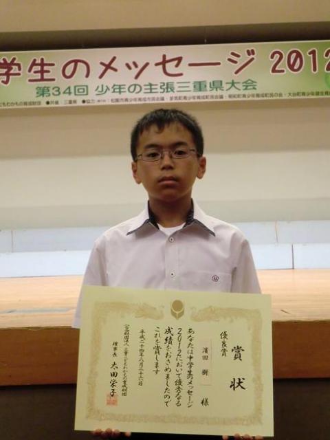 8月26日(日)、松阪市民文化会館において「第34回少年の主張三重県大会」が開催され、11077点の中から14人の代表の一人に選ばれた、1年生の濱田樹君が発表をしました。