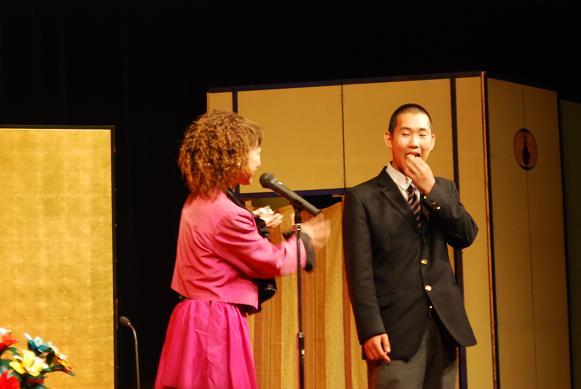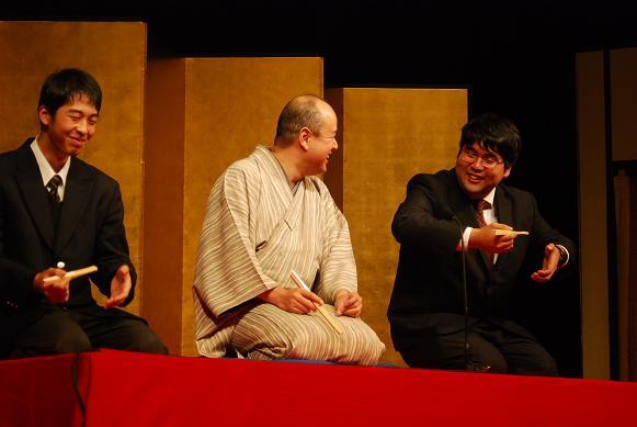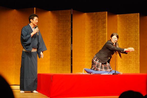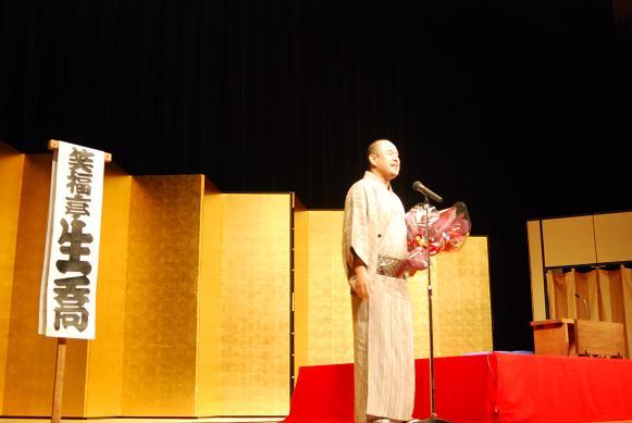 三重高校の卒業生でもある笑福亭生喬さんが中心のプログラムで、生喬さんによる落語入門で始まり、春風亭べん橋さんの「転失気」のあと、お二人による体験コーナーがあり、生徒と先生の代表が小噺や仕草に挑戦しました。