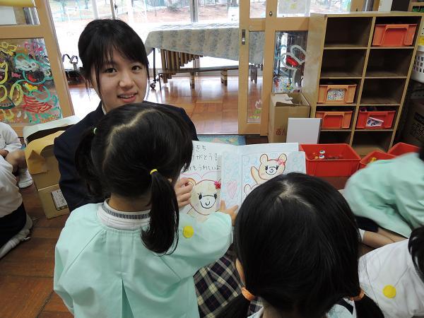 2月4日(月)にB・C組が、7日(木)にはA・D組が梅村幼稚園で保育体験をしました。家庭科の授業の一環で、幼児とのふれあいの中で自分の小さいころを思い出し、年代の違う相手のことを理解することを目的としています。生徒たちは授業で作成した手作り絵本を読んだり、一緒に話したりしてそれぞれの時間を楽しみました。生徒ののなかには梅村幼稚園出身者も多く、お世話になった先生方と久しぶりに出会うなど「里帰り」の機会ともなりました。
