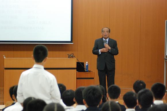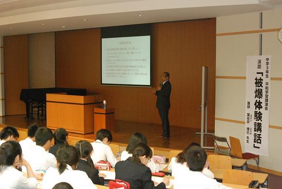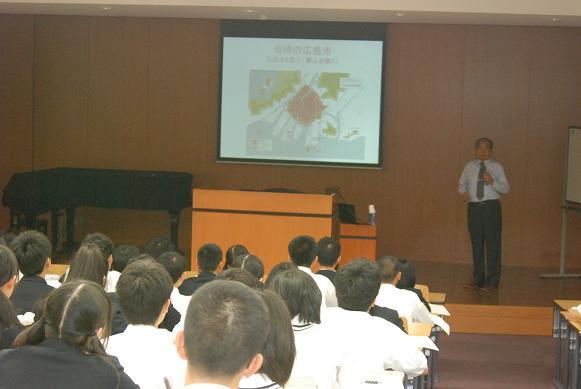 5月31日(金)、3年生研修旅行の事前研修の一環として、広島での平和学習に先立って『被爆体験講話』が行われました。今年で4年目となりますが、4回とも広島大学名誉教授の葉佐井博巳先生に来ていただき、実際に目にされた事実に加え、放射能研究の科学者としての立場からも貴重なお話をしていただきました。