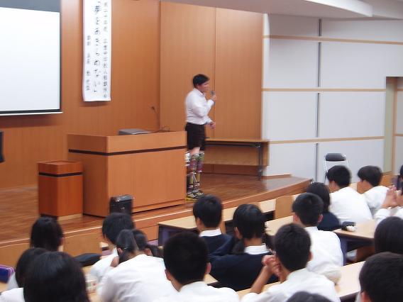 10月23日(木) 2年生の人権学習講演会が、「義足のランナー」島袋勉さんをお迎えし、開かれました。事故で両足を失った島袋さんのその後の積極的な生き方に強い感銘を受け、勇気をもらいました。マラソンで完走を果たした島袋さんの次の目標はエベレスト登頂。皆注目しています。