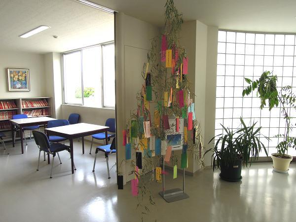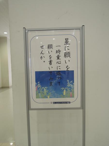 6号館の2階ラウンジに山からとってきた笹、そして傍らのテーブルに糸をつけた短冊とペンを置きました。その日のうちに笹は色とりどりの短冊でたわわ。さらに短冊を「増産」。6年生のフロアに置いたので、さすがに「第一志望合格」の類が目立ちましたが、中には書いた本人にしかわからない不思議な願いも。中にこんな短冊がありました。「みんなの願いが叶えられますよう」書いた人が知りたくなりました。
