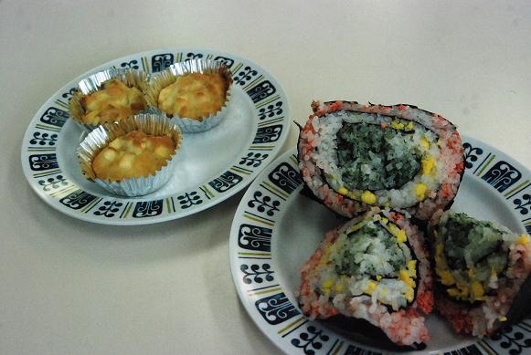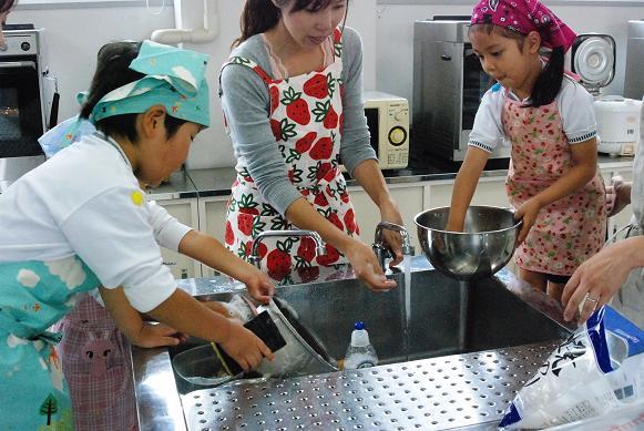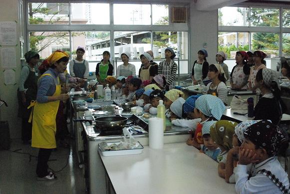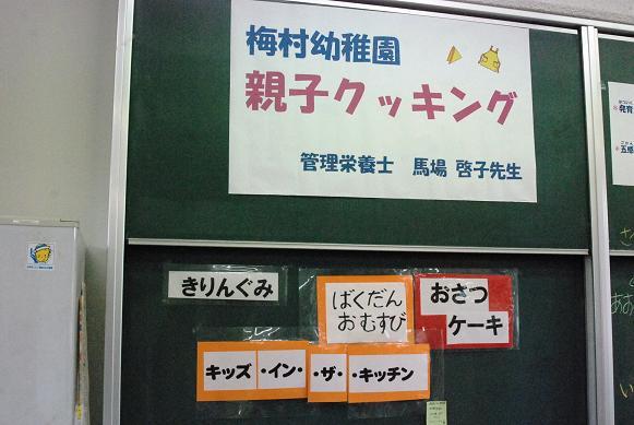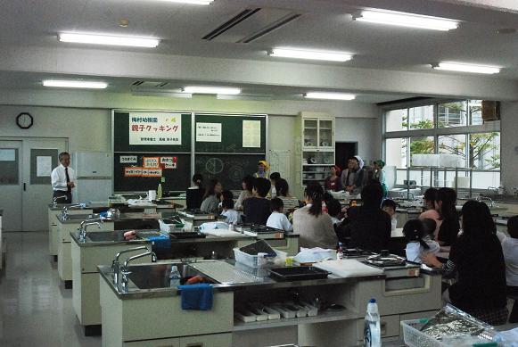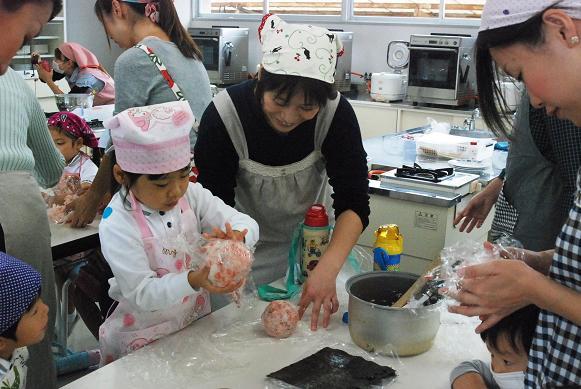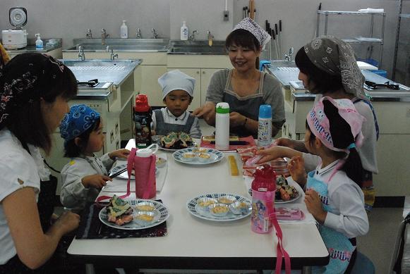 10月24日(木)、梅村幼稚園の食育行事「親子クッキング」が中学校の調理室で行われました。園児とお母さんが一緒になって、管理栄養士の馬場啓子先生の指導で「ばくだんおむすび」と「おさつケーキ」を作りました。園児は包丁の使い方、お結びづくりから、試食、そして洗い物までフルコースの体験を楽しみました。調理室は子どもたちの笑顔と歓声であふれていました。