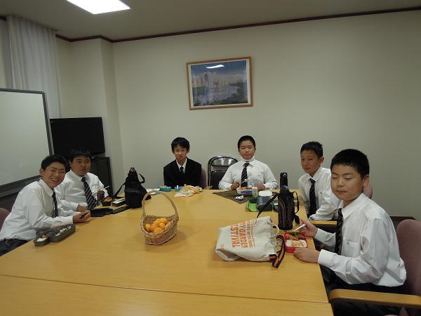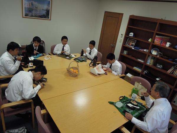 恒例の1年生と校長の昼食会を始めました。校長室の横の会議室で一緒に昼食とおしゃべりを楽しみます。初日の今日(11月1日)は6人の男子生徒がやってきました。