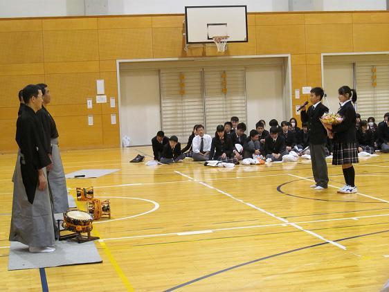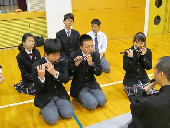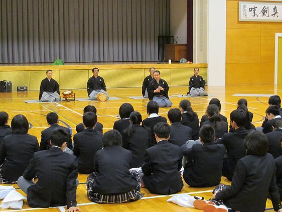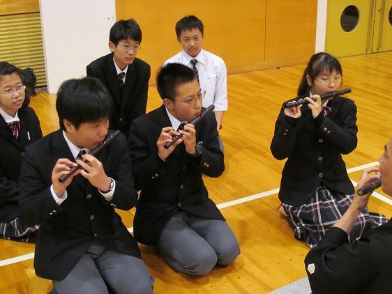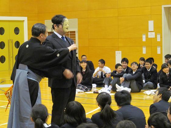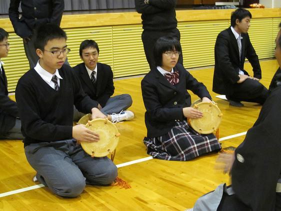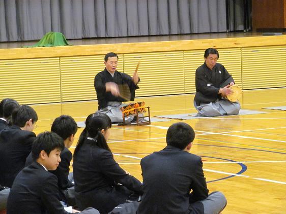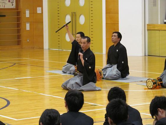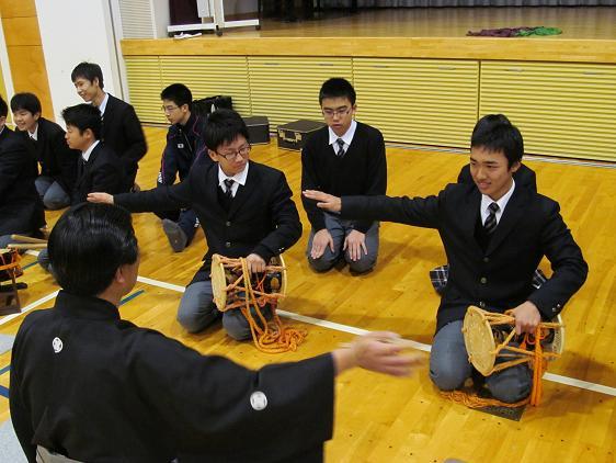ほとんどの生徒が、初めて聴く鼓や笛、太鼓の研ぎ澄まされた音に圧倒された様子でした。体験では、楽器だけでなく「舞」の所作を教えていただいたり、謡曲「高砂」の一節を一緒に謡わせていただきました。「いつか本当の能舞台を見てみたい。」多くの生徒の感想でした。