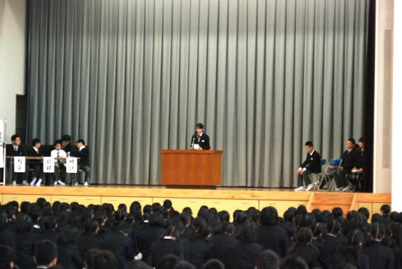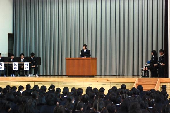 演説は、クラブの公式戦出場のため録音によるもの、英語を交えてのものと工夫がありましたが、いずれの候補者も生徒会主催行事の充実とそれにかかわる熱意を訴えていました。中学1年生の候補者は、マイクを使わず地声で堂々と演説を行い、高校生からも大きな拍手が起こりました。